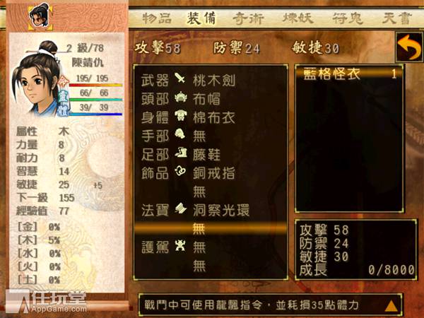 作为PC原版的移植作,iPad版倒真是十分“移植”。先不说剧情,仅从游戏画面到战斗特效再到操作方式,甚至连迷宫地图里的隐藏道具,iPad版都一一照搬原版,举个栗子,月河村客栈后方的隐藏“神物”,带有龙飚(biāo)技能的法宝“蓝格怪衣”、把水打干才能得到的150两银子(连Save/Load省材料养符鬼大法也能用哟!)等都全部还原,所以玩家们按照原版的攻略玩也是完全没问题哒!除了战斗界面稍作修改外,和原版别无二致,甚至在游戏法宝说明中还出现下图“按下Enter键”这样的提示……