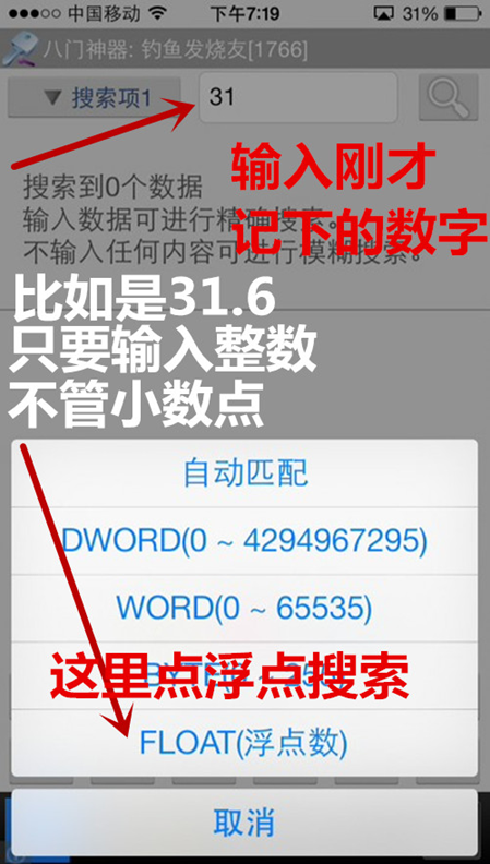 2、暂停游戏,切换到八门或是烧饼,搜刚才记下的数字(不管小数点)只搜整数比如31.5就搜31(要点浮点搜索)