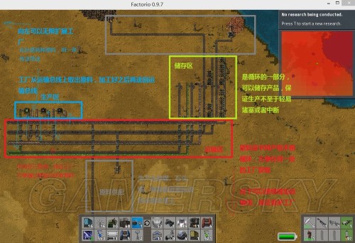 但是游戏中的所有中间产物有上百种,如此一来,就算每两种产物跑一条线,也要几十条循环线,工程量巨大,而且占地也很大。不过我们可以选择大约十几种最常用的原料和中间产物,如铁、铜、齿轮、铜丝、电路片等,大约一共需要5、6条循环线。
