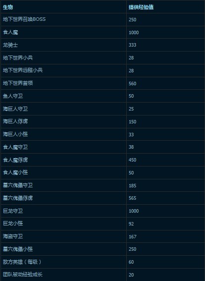 而下表中则罗列了风暴英雄中所有类型的地图生物所能提供的经验值,及其他能获得经验值的方式,包括击杀敌方英雄所能获得经验与团队被动经验成长。