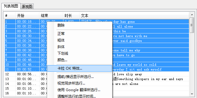 某些情况下当一个或多个场景被删除/添加时,需要对字幕进行同步。 这时你可以选择在字幕列表视图中的字幕编号,点击鼠标右键并选择 同步所选行。 你可以用这种方法调整一小段字幕。