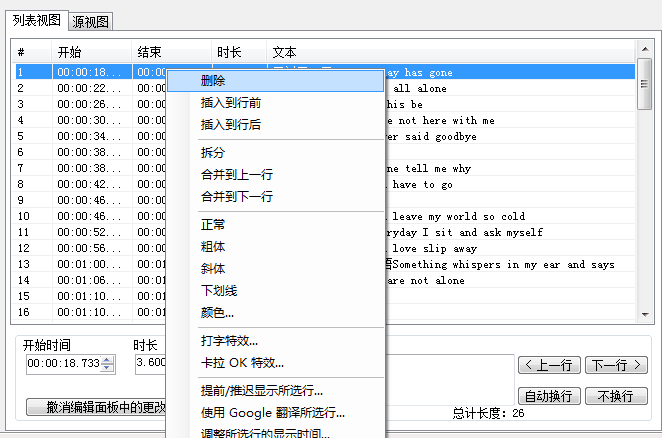 | 主窗口 | 字幕列表视图 | Delete | 删除所选行 |