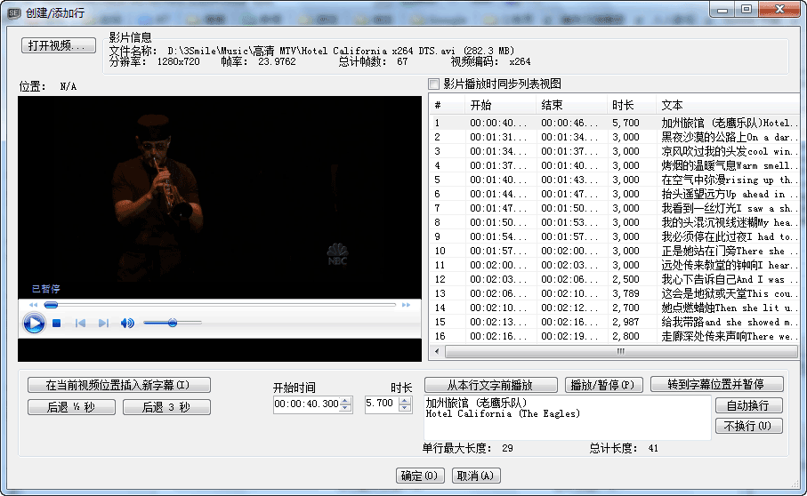 这里可以从头开始创建字幕行。 在字幕需要开始的位置暂停视频文件,并按下”在当前视频位置插入新字幕”按钮, 然后输入文字 - 会自动给出时长。 你也可以在列表视图中点击鼠标右键进行插入/合并/删除行。