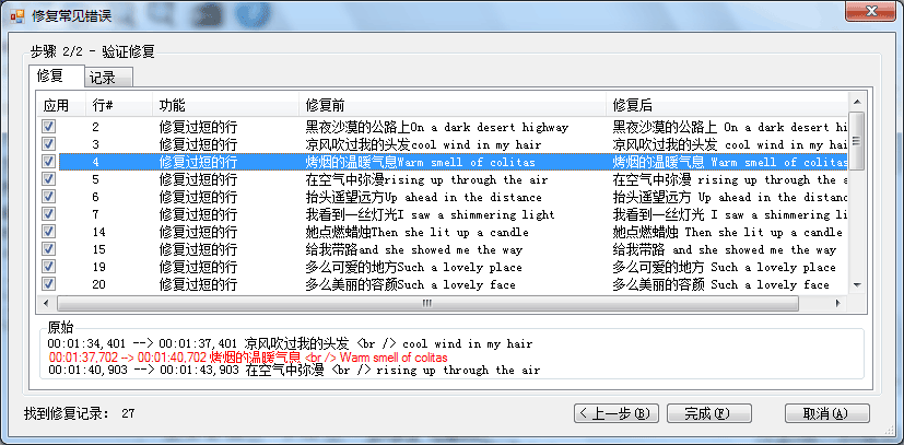 以上就是创建字幕时间轴的过程。如果你是对现有的字幕做调整,Subtitle Edit配有多种方案:可以在“创建/调整行”、主界面列表视图、“翻译助手”还有“视觉同步”等中进行。这些你只要仔细用一下就能立刻上手了(帮助文件中都有说明);Subtitle Edit可以帮你纠正英文字幕中的很多错误(工具菜单中“修复常见错误”);还可以对字幕进行拆分、合并,以及添加卡拉OK或打字特效等(鼠标右键菜单有选项),所以自己先找个字幕文件动手试试吧:)