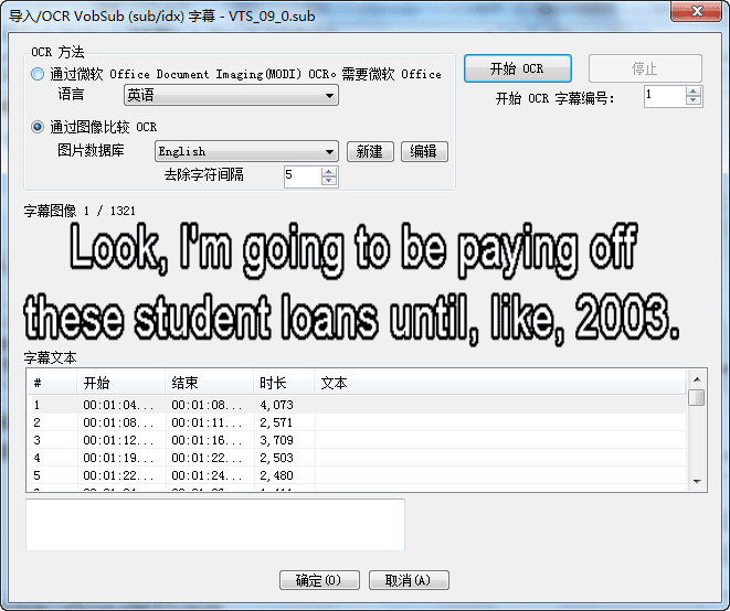 选择一种OCR方法并点击”开始OCR”按钮。完成时只需点击”确定”按钮,另要注意的是OCR生成的字幕通常包含了很多需要修正的错误。