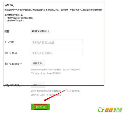 6、信息登记,需要你的身份证正反面的扫描图片,准备好哦!【提交认证】。