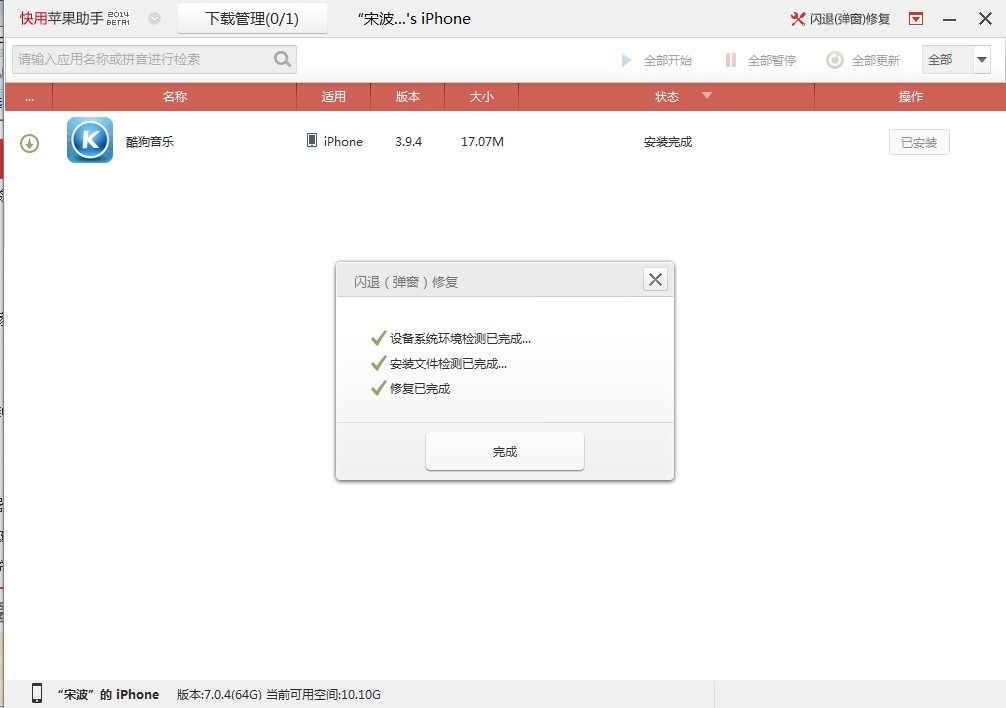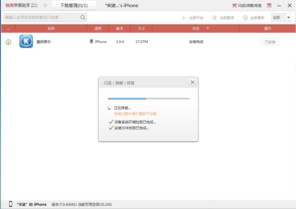 最近苹果公司的最新的ios7系统导致了很多苹果手持设备发生闪退现象,西西给大家介绍一个我自己常用的解决办法,喜欢的童鞋不妨一试。就是先在电脑里安装快用苹果助手这个程序。安装完之后用数据线连接苹果5S手机或者苹果ipad air,然后打开电脑的快用苹果助手程序,头一次电脑快用助手打开之后会提示信任或者不信任该设备,要选择信任,然后就点击电脑里的快用苹果助手的闪退修复即可。修复过程中切记不可中断连接。以后用苹果设备下载喜欢的程序要连接好电脑后用电脑里的快用苹果助手下载,下载完之后程序会自动安装,安装完之后,一定想着用闪退修复一下。闪退修复完毕之后关闭电脑的快用苹果助手,然后拔下连接设备就OK。