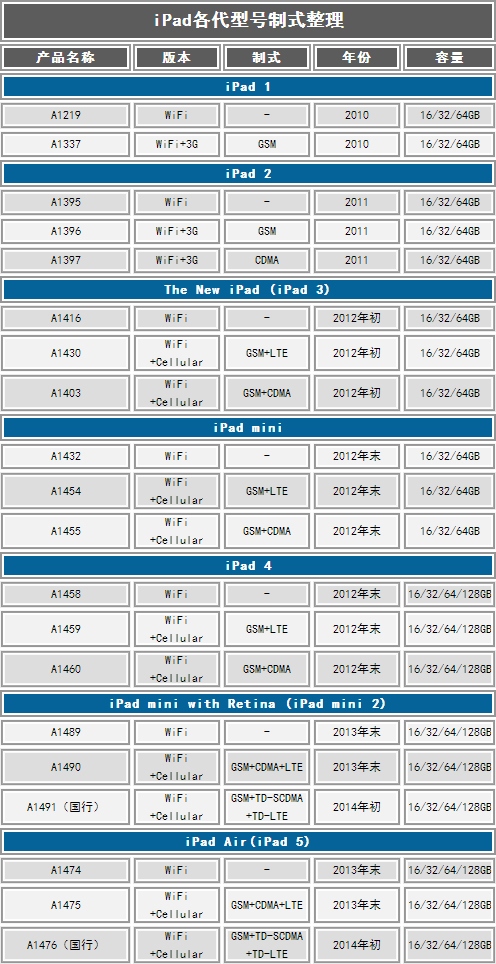历代苹果iPad型号制式整理