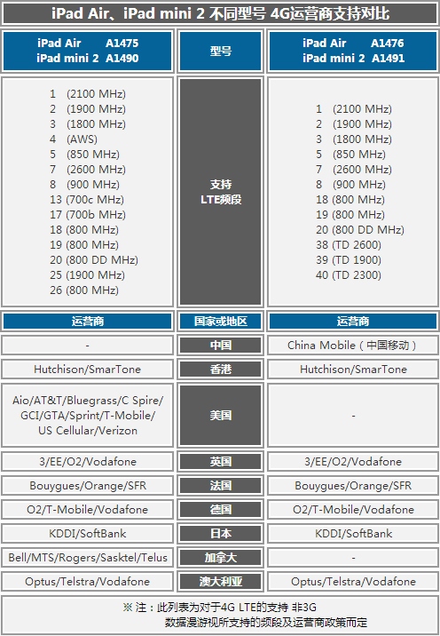 我们列出了上面的表格以方便大家阅读,从表格上来讲,目前仅有中国新发售的iPad Air和iPad mini 2的1476和1491型号支持移动4G网络,而其他国家或地区发售的版本均不支持。