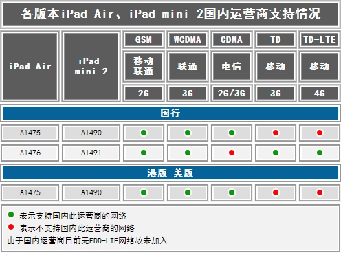问题7:对于国内的三大运营商,各个版本型号的iPad Air和iPad mini 2支持情况如何?