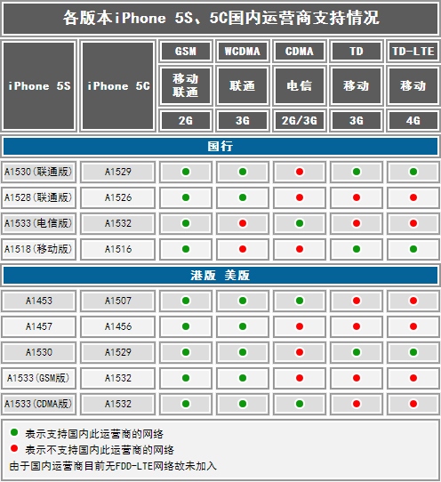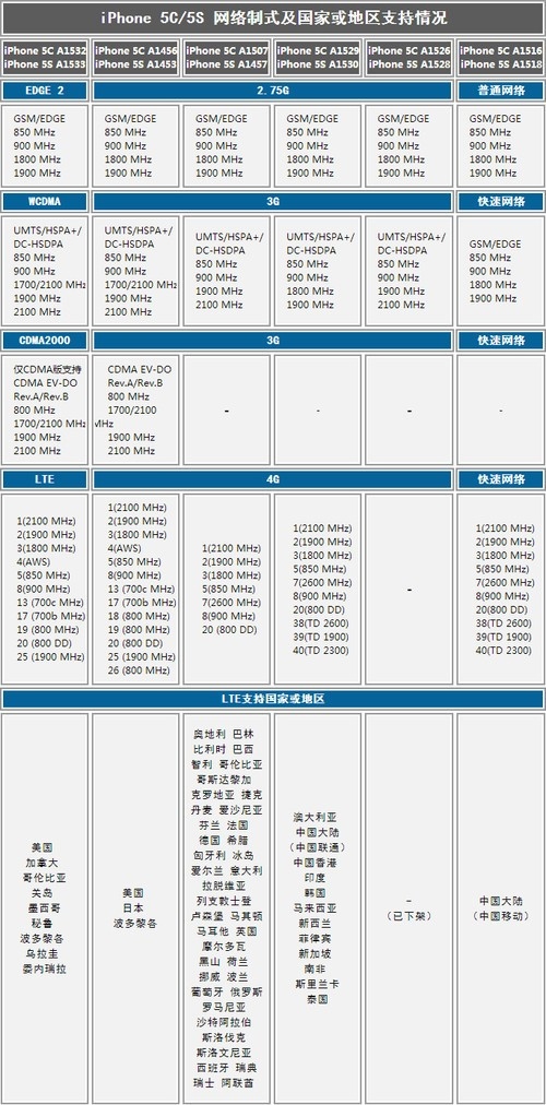iPhone 5s各型号支持制式