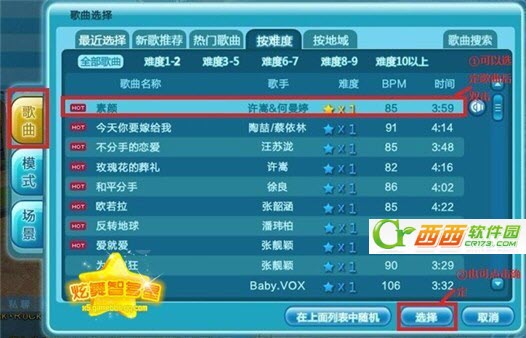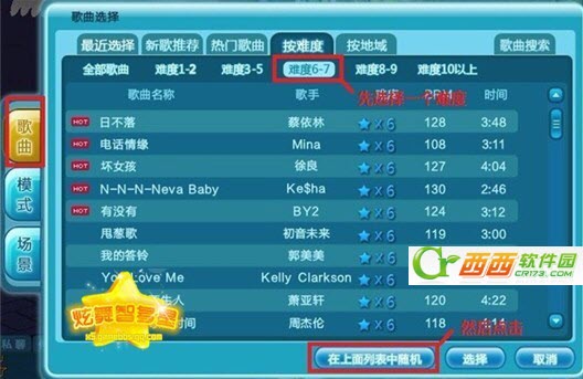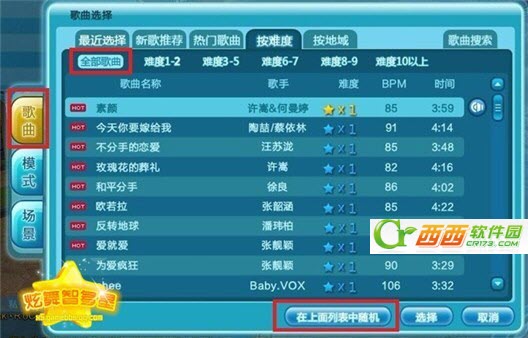 ③按难度随机选歌,首先选取一个难度段,然后点击下方“在上面列表中随机”