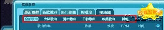 歌曲选择分为:最近选择、新歌推荐、热门歌曲、按难易度、按地域以及歌曲搜索