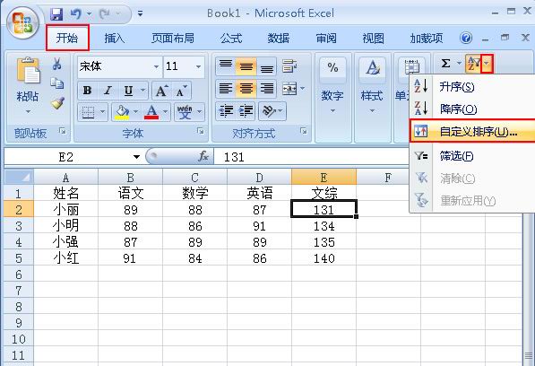 1、我们现在Excel中打开一篇工作表,点击功能区的”开始“选项卡,在”编辑”区域选择“排序和筛选”的图标。然后点击它的倒三角按钮,在弹出的下拉菜单中选择“自定义排序”命令;