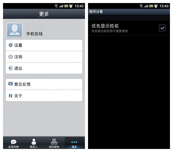 而在软件设置方面,也就是手机底部的“更多”功能区,及其精简。只有优先显示姓名及注销、退出功能。
