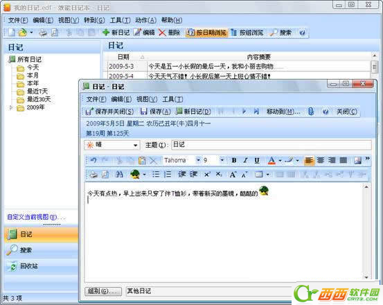 他是是用来写日记的,软件提供了强大的日记编辑功能,用户可以随心所欲的在日记中插入表格、图片、超链接甚至附件等您认为任何有价值的东西。此外,用户还可以单独设置某篇日记的背景色、背景图片等信息。