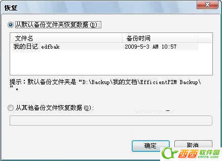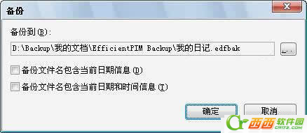 效能日记本提供备份功能,支持用户备份已经创建的日记本数据。程序的默认备份目录是“我的文档\EfficientPIM Backup”。用户可以将其转移至其他硬盘分区或者直接拷贝在U盘中迁移到其他电脑上。效能日记本备份文件的扩展名为.edfbak。