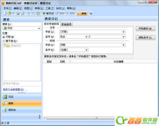 效能日记本提供搜索功能,允许用户通过文本内容搜索已有数据,同时,程序也提供了按分组、按时间(如记录的创建时间和更改时间)来搜索记录的服务。用户只需单击工具栏的“搜索”按钮即可转到搜索功能模块。一般情况下,用户只需在搜索内容文本框中输入要搜索的文字,然后按下回车键即可。当然,您也可以详细指定要在什么字段中搜索文字,还可以指定是包含该文字即可,还是需要开始于该文字或者完全与输入的文本内容一致。您还可以根据记录的创建时间、更改时间等条件来搜索记录。