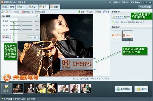 美图淘淘带有较为方便且人性化的水印导入功能。如图01所示,在软件的“水印”标签功能页,点击“新增水印”按钮可从硬盘目录导入事先准备好的水印图 片;随后在“我的水印”框中点选刚导入的水印图即可添加到宝贝图片上(在美图淘淘中进行的美化处理都是批量同步到所有图片上的哦,很方便吧)。最后,可以 根据宝贝图片的构图需要,调整水印图片的放置位置以及透明度,使之不影响整体的美观。