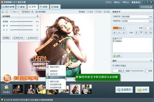通过上述两种水印添加的方法介绍,我们不难发现在美图淘淘中可以很有针对性的为宝贝图片添加各种个性水印效果,提升网店印象同时又防止图片被盗。其实, 美图淘淘还带有许多特别针对网店应用的美图功能,比如批量添加促销素材、漂亮边框等;而且,制作好的宝贝图片可以直接在软件里上传至淘宝官方图片空间,轻 松完成宝贝上架工作!