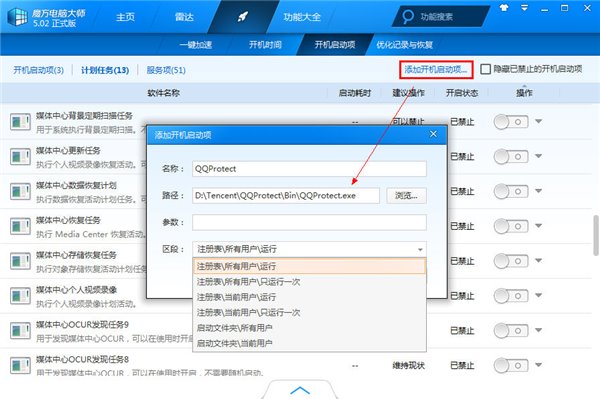 4、魔方电脑大师还有一个值得称道的功能,就是添加开机启动项。如下图所示,在开机启动功能中,就可以直接浏览需要开机启动的程序,并设定开机启动方式,如注册表、启动文件夹、所有用户、当前用户等。