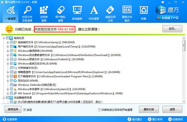 2、魔方清理大师是目前最强悍的系统垃圾清理工具。系统垃圾、浏览器缓存、视频音乐目录缓存、常用软件缓存等都可以清除,而且非常关键的是,不同于其他软件长时间的扫描,魔方清理大师的扫描速度非常快,而且扫描的也很干净。如图所示,清理大师就扫描出946.42M的垃圾文件。