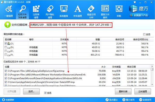 3、魔方清理大师还提供了“垃圾文件深度清理”功能,深度扫描系统垃圾文件、缓存文件、临时文件,甚至你还可以添加需要清理的文件类型,其他的直接交给魔方扫描清理即可。