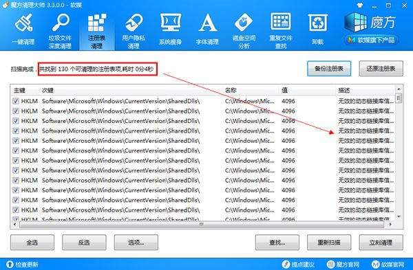 4、魔方清理大师另一个闪亮的清理功能就是清理注册表。在清理大师中,可以设置清理无效动态链接库信息、无效文件类型、无效的程序路径、无效的软件卸载信息等各类无效注册表值、错误注册表项、冗余注册表信息。看下图注册表扫描清理的结果:4秒钟扫描出100多项可删除的注册表无效信息。