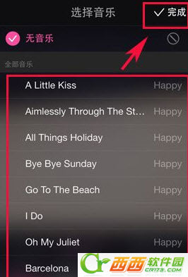 2)进入后,大家就能看到有很多美拍自带的背景音乐,可以选择你可以你喜欢的进入选择,然后点击【完成】,到这,背景音乐就已经添加完成了。
