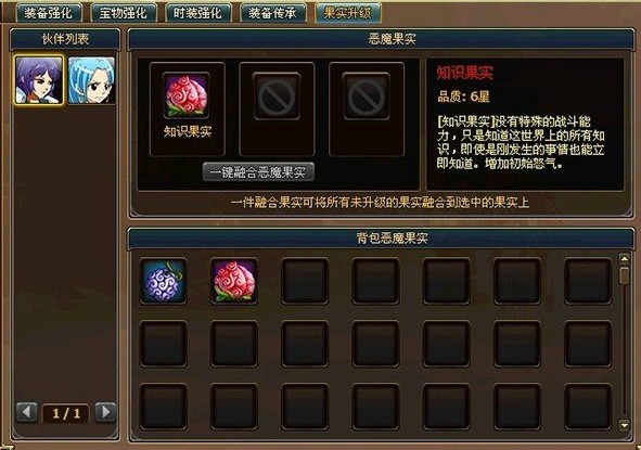 如果想给恶魔果实升级,可以技术革新开强化面板-果实升级选项来进行果实升级,原理与宝石升级类似,将果实拖动到需要升级的果实上就可以让需要升级的果实获得经验了。一键融合恶魔果实会将背包中的品质差于选取中果实的其他所有果实快捷融合到选中果实上。