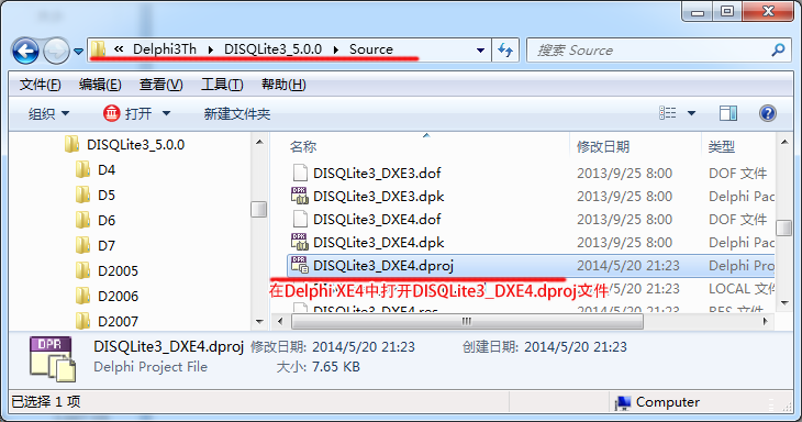 3、在Delphi XE4 的IDE中打开DISQLite3安装目录中的Source目录中的DISQLite3_DXE4.dproj文件,如下图所示: