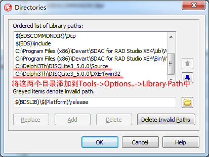 2、接下来将Source目录和DX4目录添加到DelphiXE4的Tools->Options…->Library path中,基于DISqlite3的程序在编译的时候需要,如下图所示: