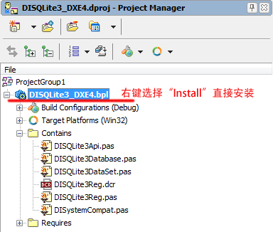4、打开.dproj文件后在Project Manager中点击DISQLite3_DXE4.bpl上点击右键Install,至此已经安装完毕该组件了。