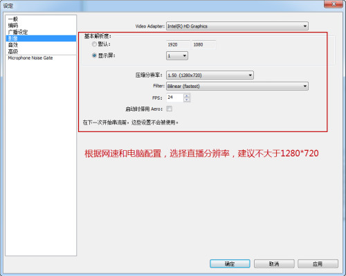 直播画面分辨率: 设置-影响 显示屏 帧数 FPS :24 (建议24,高了会占用大量资源)