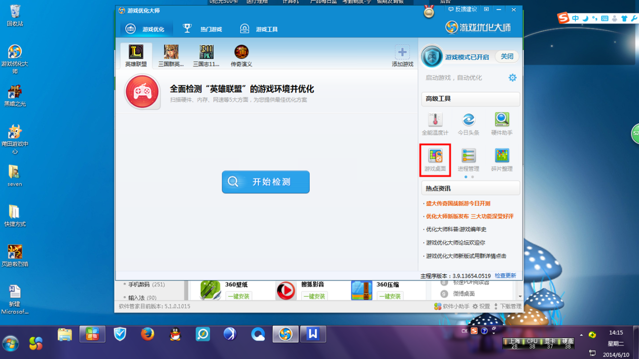 想在暴风雨里来临之前,痛痛快快的和队友玩一场?快打开游戏优化大师,点击右边高级工具——游戏桌面。