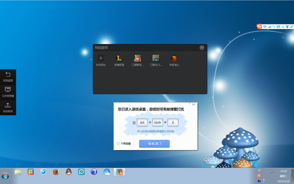 这个工具最大的好处不止是防住女朋友弹的视频,更能拦住奇奇怪怪的广告,某些游戏box弹得广告抖动的图片加上销魂的音效真是跳进黄河也洗不清啊…“妈!这真不是我点开!!”对了,游戏桌面里还可以通过启动程序打开希望在本桌面上使用的程序,如YY、爱拍等等。