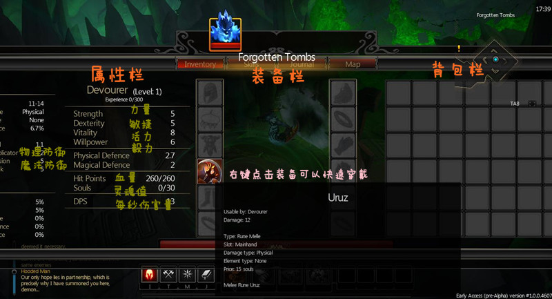 按I键可以快速开启物品栏,在物品栏的左手边是人物角色的属性值,而中间则是人物角色目前所穿戴的装备,右侧是背包内的物品。