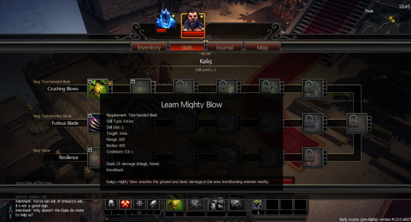 强力一击:需要双手武器;主动技能;范围攻击(幅度300、半径400);冷却时间为5.9秒;25点魔法伤害。