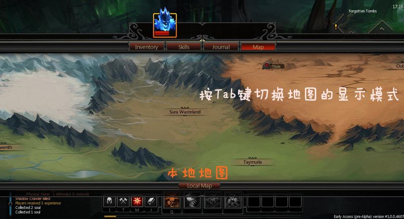 按M键能够快速开启世界地图,alpha版世界地图中显示出会有5大地区,而点击地图下方的“本地地图”能够开启玩家如今所在的地图。