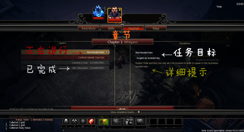 玩家可以在这里查阅已完成的任务(灰色框框)以及正在进行的任务的明细,其中包括支线任务和主线任务。