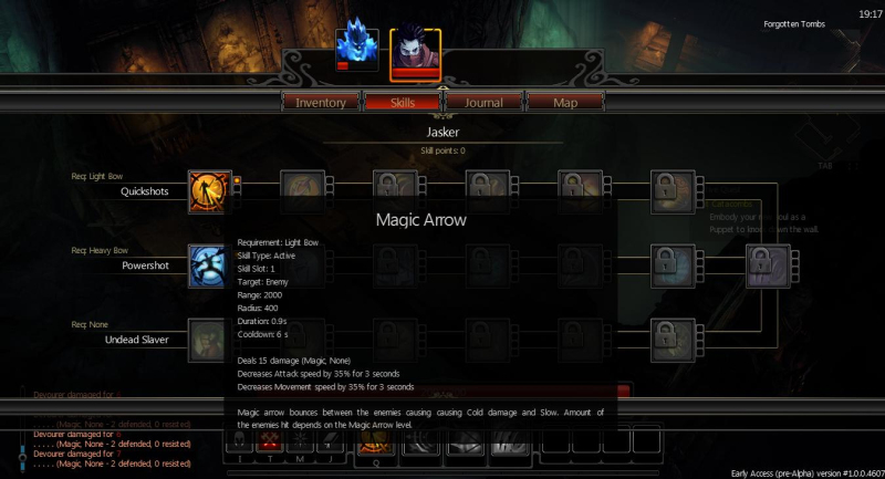 魔法箭矢:需要配备光弓箭;主动技能;目标敌人;攻击范围(半径400);持续时间0.9秒、冷却时间6秒;造成15点魔法伤害、减少敌人攻击速度35%(3秒内)、减少敌人移动速度35秒(3秒内)。