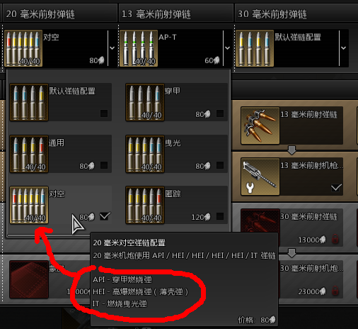 飞机的航炮可以换装不同类型的弹药,不同类型的弹药的打击效果也不一样,如图所示,一链炮弹里包含了好几种不同的弹药,弹药的配比会显示在图中,可以文字介绍相匹配。弹药也可以在进入战斗后选择。