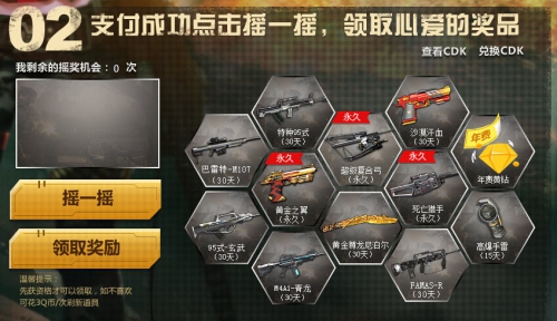 02、支付成功点击摇一摇,领取心爱的奖品黄金之翼、超级复合弓、死亡猎手均在礼包中