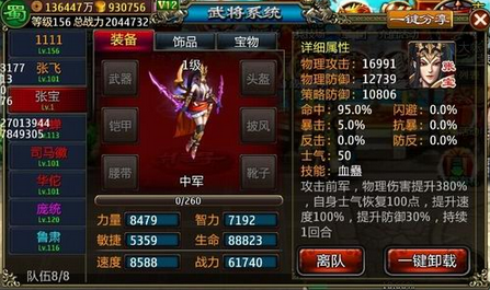 这位豪杰正是黄巾头目张宝!她(……)的军种被设定为中军,六围不错,各项属性可圈可点,技能更是战略性超群!攻击前军,物理伤害提升380%,自身士气恢复100点,提升速度100%,提升防御30%,持续一回合!