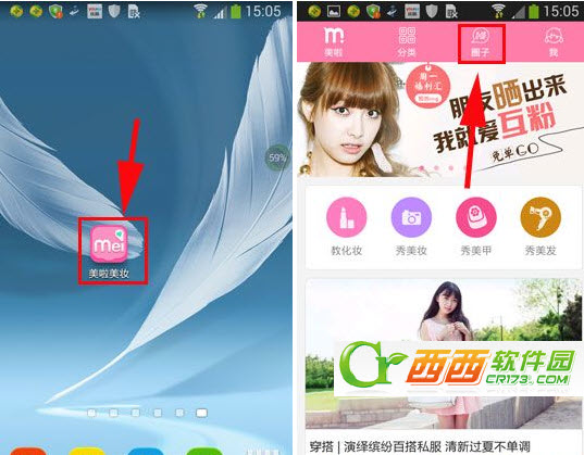 1.首先在手机桌面打开【美啦美妆】,进去以后点击屏幕上方【圈子】(如下图所示)
