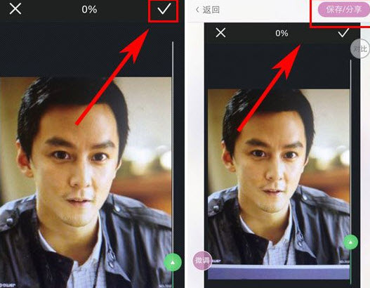 制作完成后,点击“保存/分享”按钮就可以将已处理的照片进行保存及分享操作啦。