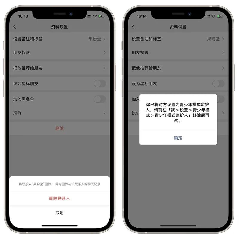 操作完成后,关闭青少年模式。当对方想要拉黑或删除你的时候,就会弹出禁止操作的提示了。