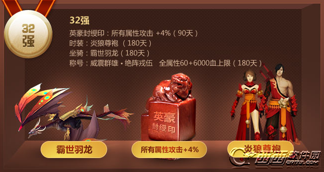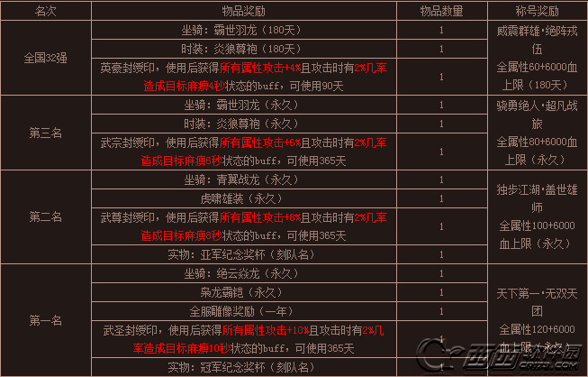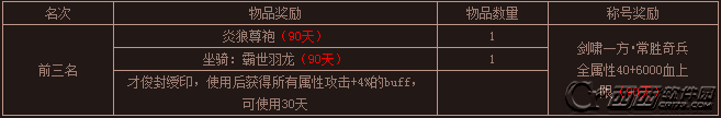 7月21日服务器预选赛正式开赛后,每周参赛次数达到10场即可领取霸者侠情锦盒奖励,每周可领取一次,锦盒中可开出:天灵丹、彻地符箓、天罡强化露、金刚锉、乾坤壶、金蚕丝*5、融魂丹•游龙其中的一种。