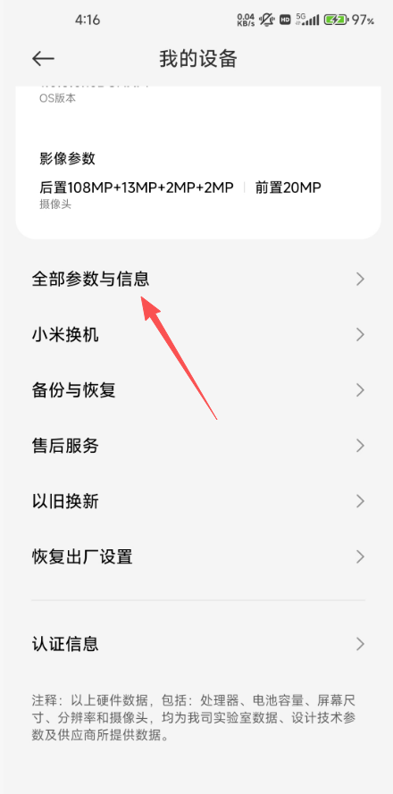 2、在我的设备界面下拉,点击全部参数与信息选项