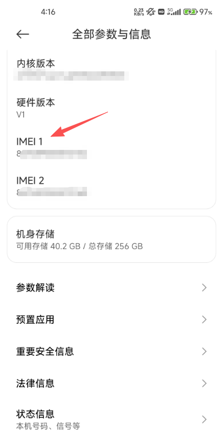3、继续下拉即可找到IMEI,这个IMEI的数字就是你的手机的did了